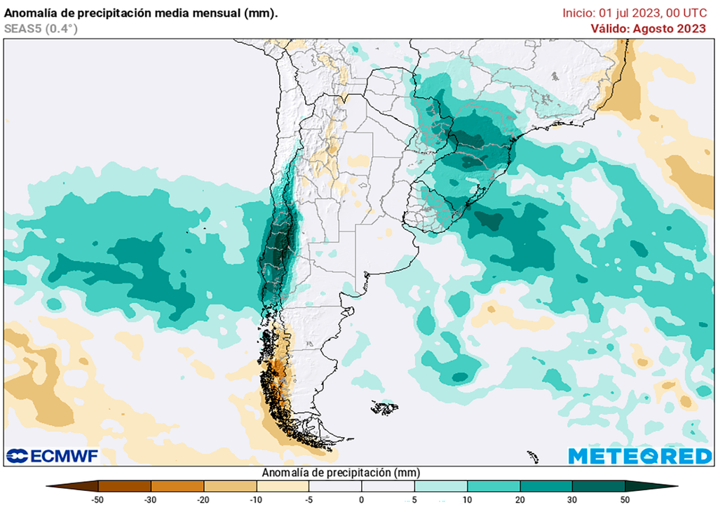 Anomalía de lluvias previstas para el mes de agosto según los mapas propios basados en el modelo ECMWF. Muestra que comienzan a mejorar los niveles de lluvia.