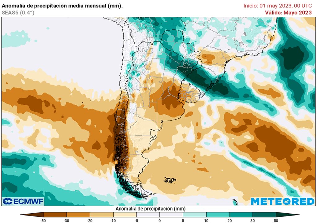 Cuando comenzamos a analizar la tendencia de la anomalía de lluvias a nivel país, observamos que en los mapas propios de Meteored basados en la previsión del modelo ECMWF se empiezan a notar ciertos atisbos de mejoras pluviométricas sobre el extremo noreste del país.